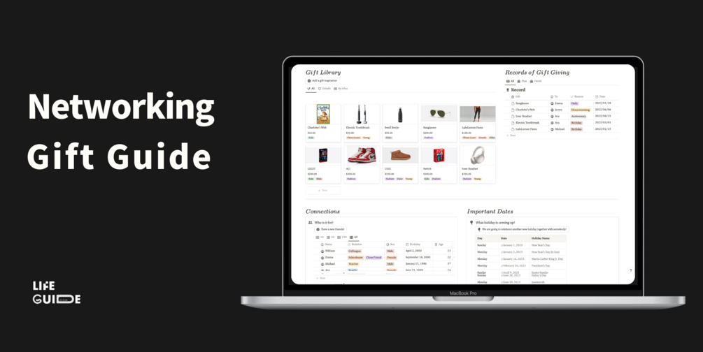 Are you tired of forgetting important dates, struggling to find the perfect gift, or losing track of your valuable connections? We've got you covered! Introducing the "Networking Guide" Notion Template β your secret weapon for building and maintaining meaningful relationships effortlessly.