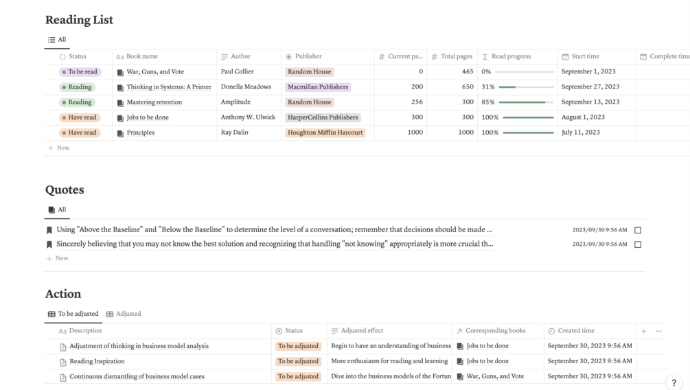 - Book Management: Your hub for all things reading, with databases such as Reading List to Library and status-based boards like In-progress Read. House your reading details, reflect on your progress, and draw insights all in one place.