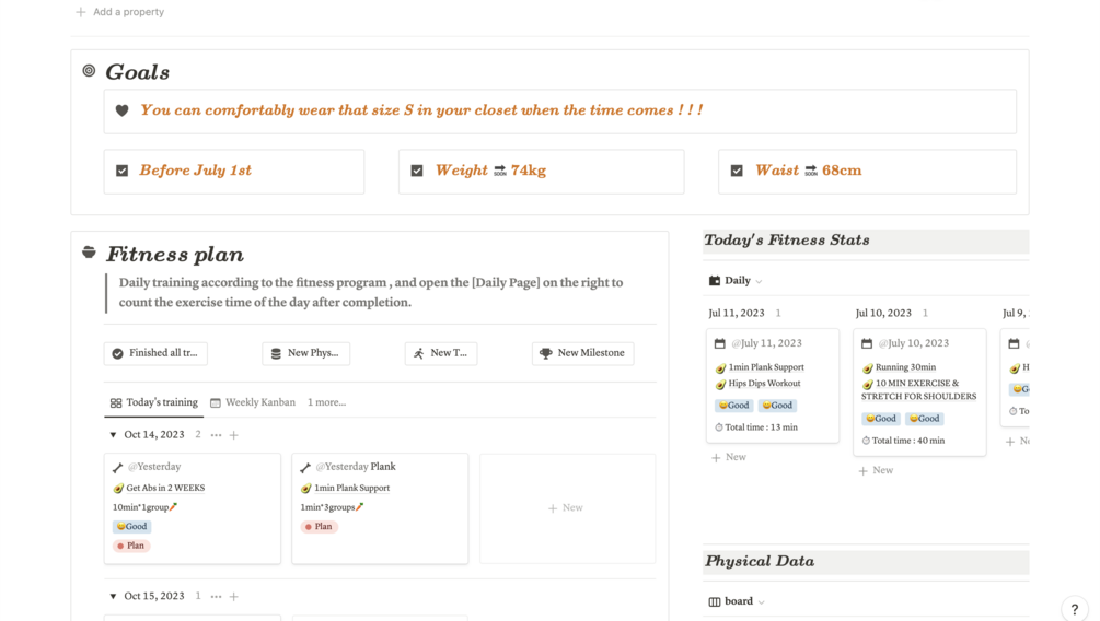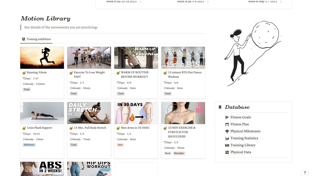 - weekly/monthly exercise metrics and indicators.